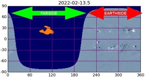 O que causou essa explosão? A heliosismologia oferece uma pista. Ao analisar as vibrações na superfície do Sol, o Observatório Solar Dynamics da NASA pode produzir mapas aproximados do lado mais distante do Sol. Há uma concentração significativa de magnetismo: