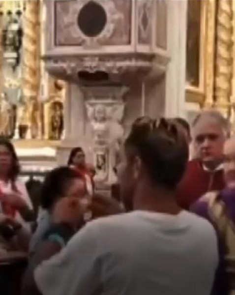 O indivíduo, que certamente não é um católico, pegou a Hóstia consagrada e não A levou à boca, mas ergueu-A em direção à multidão e afirmou heréticamente que ali NÃO estava o Corpo de Cristo.