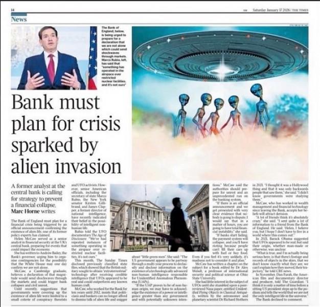 Vida Extraterrestre e Impactos Econômicos. De acordo com um artigo recente do The Times, um ex-analista do Banco da Inglaterra argumentou que a instituição deveria se preparar para uma grande crise financeira que poderia ser desencadeada por um "anúncio oficial confirmando a existência de extraterrestres".